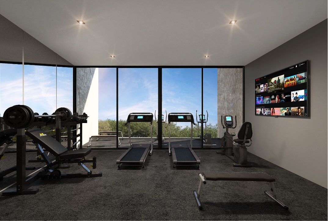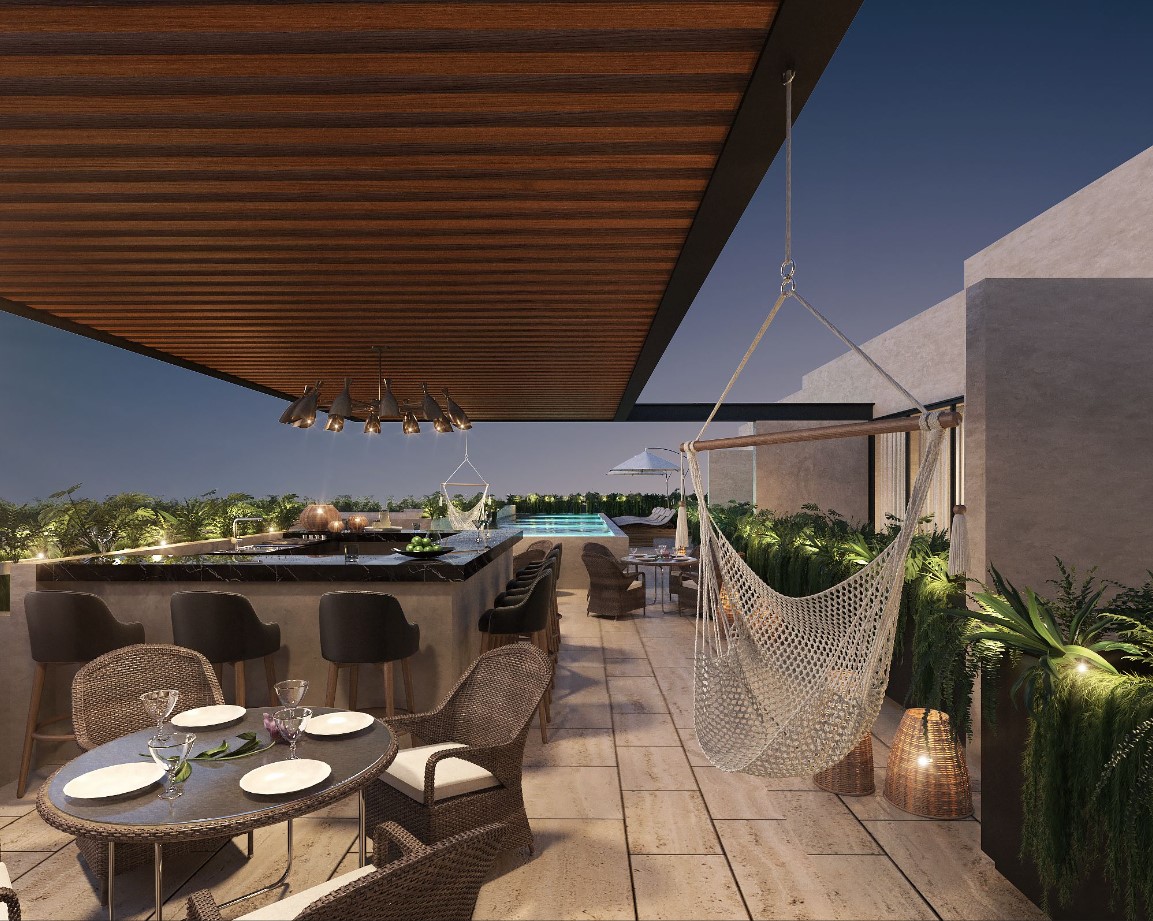 Gimnasio, bar / terraza, alberca, elevador, wi-fi, caseta de vigilancia, lobby y recepción, cámaras de vigilancia, social room, área de asadores, estacionamiento techado.